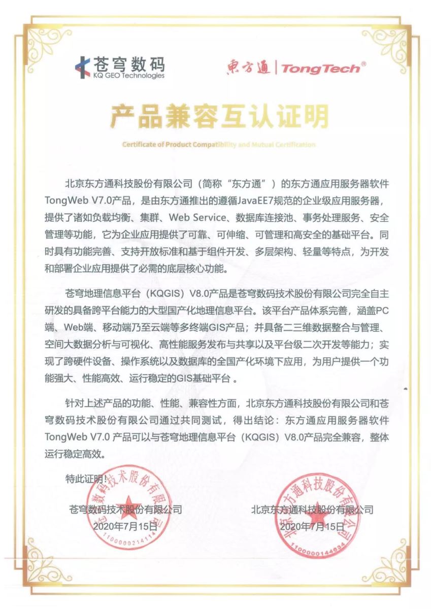 日前,蒼穹數(shù)碼技術(shù)股份有限公司的KQGIS V8.0和北京東方通科技股份有限公司(以下簡稱"東方通”)的東方通應(yīng)用服務(wù)器中間件軟件TongWeb V7.0完成兼容性互認證。