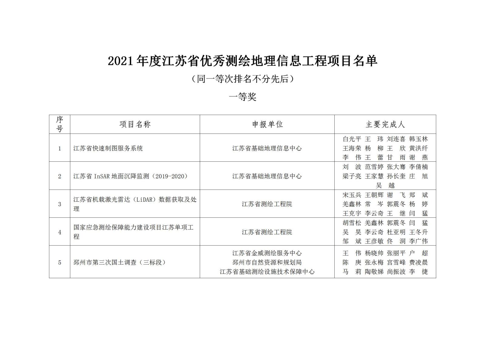另外,由江蘇省基礎地理信息中心完成的“江蘇省快速制圖服務系統(tǒng)”等20余個項目擬評為2021年度江蘇省優(yōu)秀測繪地理信息工程一等獎;江蘇省測繪工程院完成的“鹽城市大比例尺地形圖測繪市區(qū)1∶500正射影像圖制作及地形圖測繪”等55個項目擬評為2021年度江蘇省優(yōu)秀測繪地理信息工程二等獎;江蘇省地質測繪院完成的“江蘇省2020年地理國情監(jiān)測(任務區(qū)六)”等97個項目擬評為2021年度江蘇省優(yōu)秀測繪地理信息工程三等獎。