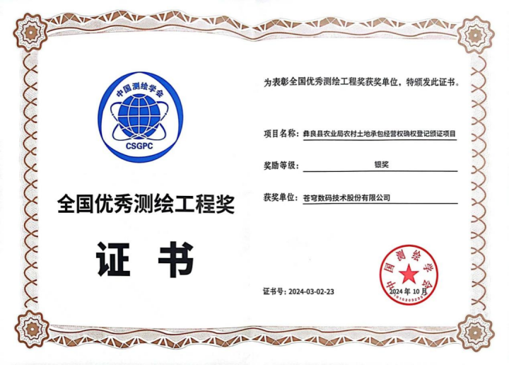 作為中國領(lǐng)先的地理信息開發(fā)及服務(wù)商,蒼穹數(shù)碼于測(cè)繪地理信息領(lǐng)域持續(xù)深入耕耘,成績顯著。主導(dǎo)研發(fā)的“彝良縣農(nóng)業(yè)局農(nóng)村土地承包經(jīng)營權(quán)確權(quán)登記頒證項(xiàng)目”,憑借嚴(yán)謹(jǐn)?shù)墓ぷ鲬B(tài)度、先進(jìn)的技術(shù)手段以及高質(zhì)量的成果展現(xiàn),榮膺“全國優(yōu)秀測(cè)繪工程銀獎(jiǎng)”。此項(xiàng)目的成功,不但彰顯了我們?cè)跍y(cè)繪工程領(lǐng)域的專業(yè)水平與卓越能力,而且是對(duì)保障農(nóng)村土地權(quán)益、助推農(nóng)業(yè)現(xiàn)代化發(fā)展方面所作貢獻(xiàn)的高度肯定。