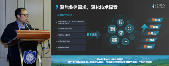 學(xué)術(shù)研討為業(yè)內(nèi)專家學(xué)者搭建了一個(gè)共商自然資源和國土空間數(shù)字化治理技術(shù)研究路徑的開放平臺(tái),也為推動(dòng)自然資源領(lǐng)域信息化進(jìn)程、加強(qiáng)跨學(xué)科合作奠定了基礎(chǔ)。蒼穹數(shù)碼技術(shù)股份有限公司董事長(zhǎng)徐文中、軟件事業(yè)部總經(jīng)理李慈武參加研討并作主題報(bào)告,將當(dāng)前在自然資源領(lǐng)域應(yīng)用探索的前瞻性信息技術(shù)進(jìn)行了交流分享,提出“更綜合的數(shù)據(jù)治理體系、更智能的平臺(tái)支撐能力、更開放的資源共享應(yīng)用、更協(xié)同的業(yè)務(wù)橫縱流轉(zhuǎn)、更精細(xì)的數(shù)據(jù)管理應(yīng)用”數(shù)字化轉(zhuǎn)型技術(shù)之路,同時(shí)以實(shí)踐案例闡述了GP模型、AI大模型、自然語言識(shí)別等技術(shù)融合業(yè)務(wù)應(yīng)用的研究進(jìn)展與后續(xù)探索方向。