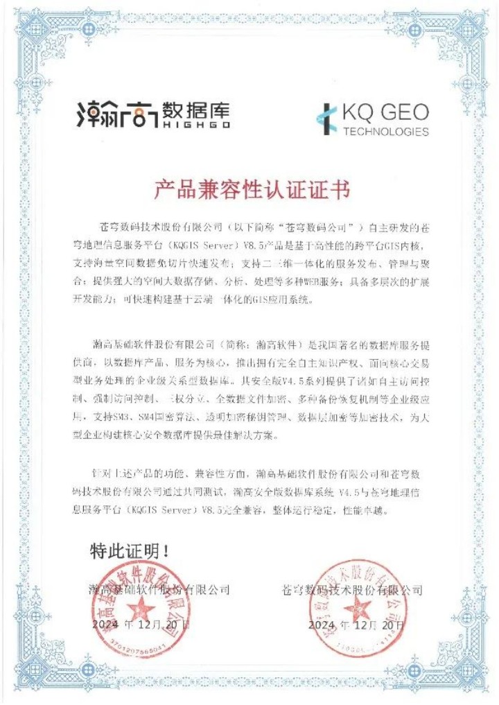 蒼穹數(shù)碼與瀚高數(shù)據(jù)庫完成產(chǎn)品兼容性互認(rèn)證