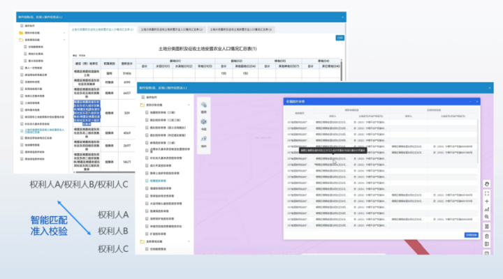 同時(shí)提供準(zhǔn)入一體化核驗(yàn)功能進(jìn)一步減少補(bǔ)正、退件問題,通過構(gòu)建準(zhǔn)入審查分析規(guī)則,強(qiáng)化對(duì)報(bào)件數(shù)據(jù)格式規(guī)范、部用途管制監(jiān)管規(guī)范、省廳業(yè)務(wù)準(zhǔn)入規(guī)范、空間準(zhǔn)入規(guī)范四個(gè)層面的一體化核驗(yàn),保障所有業(yè)務(wù)要素、技術(shù)指標(biāo)嚴(yán)格契合部、省兩級(jí)審批標(biāo)準(zhǔn),有力確保部用途管制監(jiān)管通過率達(dá)到100%。為提升準(zhǔn)入核驗(yàn)的精準(zhǔn)度與智能化水平,引入DeepSeek大模型,借助其強(qiáng)大的知識(shí)圖譜構(gòu)建與語義理解分析能力,實(shí)現(xiàn)用地審批中被征(用)地單位權(quán)屬名稱與不動(dòng)產(chǎn)權(quán)利人名稱的智能比對(duì)核驗(yàn),規(guī)避因命名邏輯不一致而導(dǎo)致的準(zhǔn)入判斷錯(cuò)誤問題。